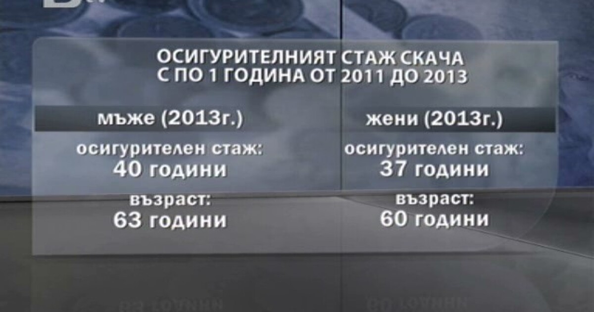 Стажът за пенсия ще нараства плавно от догодина. През 2013-а година жените ще могат да се пенсионират с 37 години, а мъжете - с 40 години стаж. Като възрастта се запазва - 60 години за жените и 63 за мъжете.