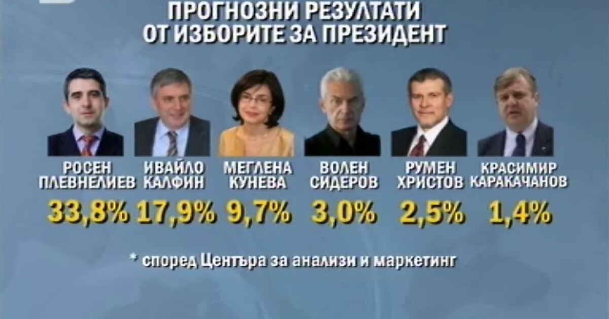 Ако на втори тур се класират Плевнелиев и Меглена Кунева, Плевнелиев ще спечели с 41.8 процента срещу 20.2 за Кунева, са прогнозите на Центъра за анализи и маркетинг.