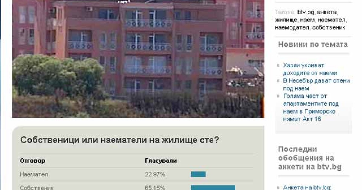 Предпочитаме да купуваме жилища, отколкото да наемаме. Това показват резултатите на анкета на btv.bg, в която повече от 65% от участниците са посочили, че са собственици. Наематели са близо 23%, а 7 на сто изплащат ипотека.