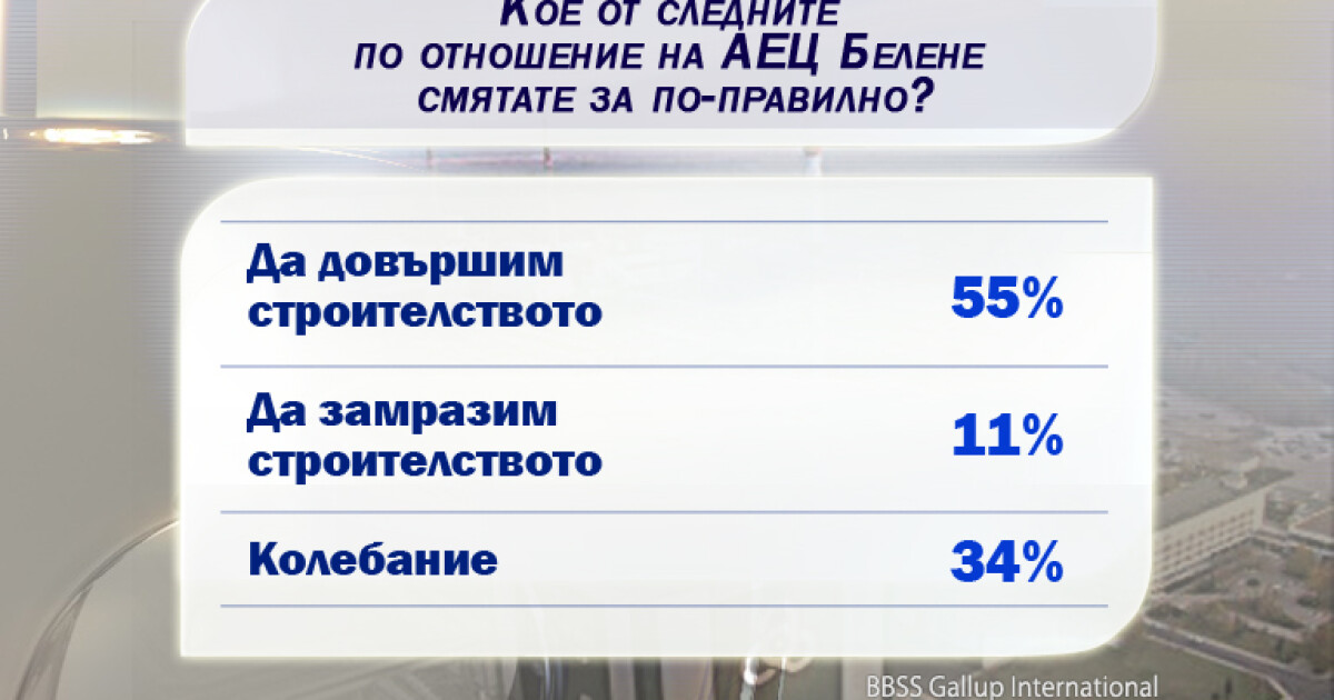 Над половината от пълнолетното население на страната е на мнение, че независимо от кризата, България трябва да намери начини да завърши строителството на АЕЦ "Белене". За замразяването на проекта се обявяват около една десета от българите.