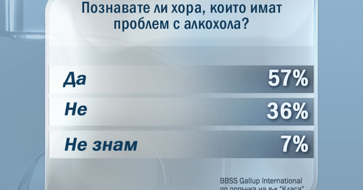 Над половината българи се опасяват, че сред познатите им има човек, който има проблеми с алкохола. Данните са от специалното национално-представително проучване на "Галъп Интернешънъл", направено по поръчка на вестник "Класа".