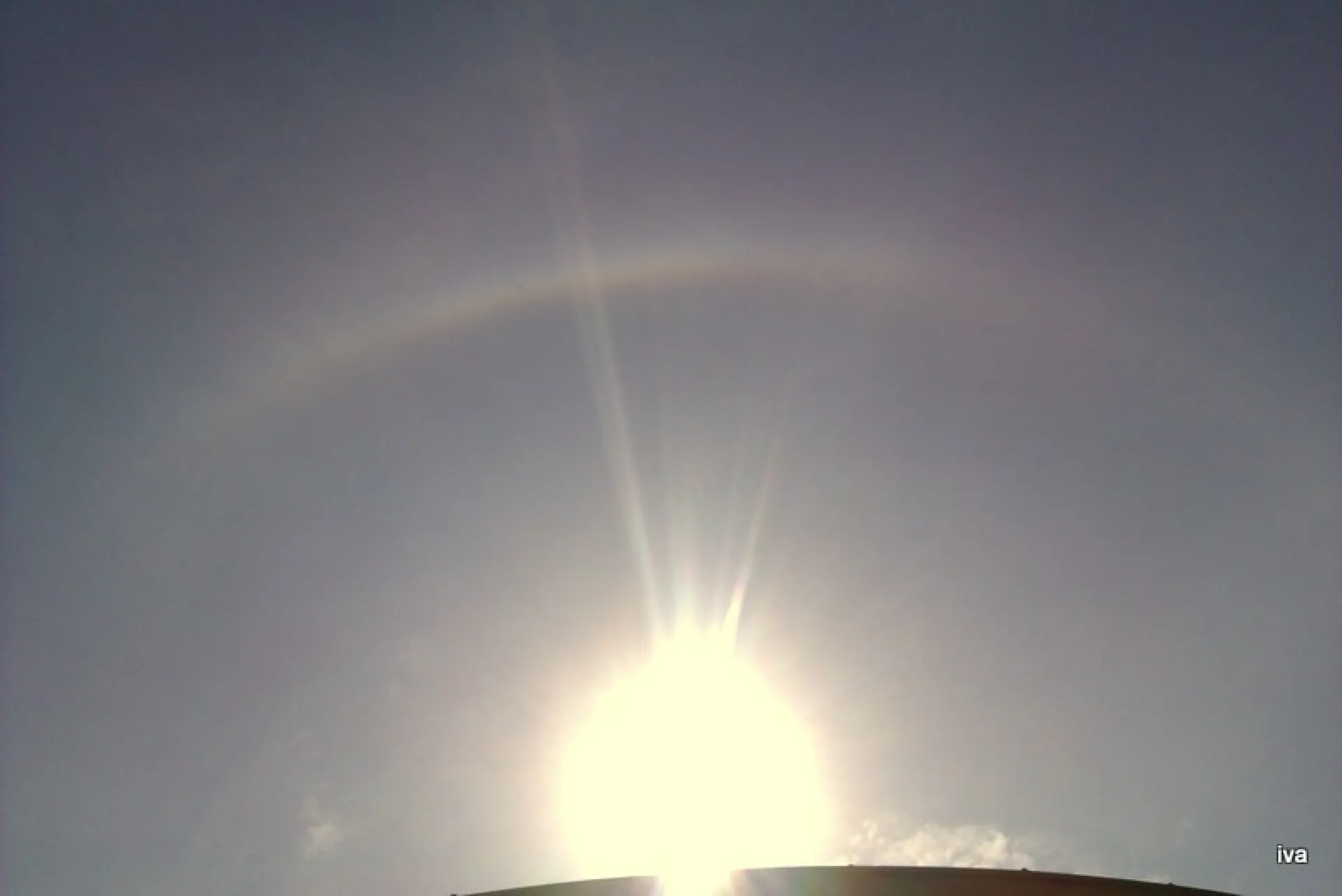 Това се видя над една бензиностанция, докато зареждах.Над слънцето, по обяд се появи малък кръг дъга.Макар че от месеци не е валяло. Като видяха какво снимам и други взеха да снимат явлението.Случката е в гр.Созопол