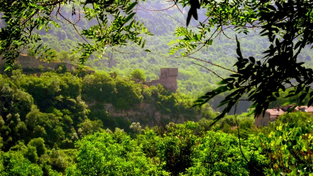Балдуиновата кула в една пролука между зеленината.
