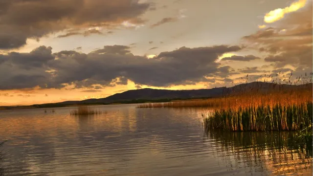 Край езерото по залез слънце