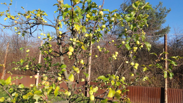 Ябълка„петровка“-цъфна през септември,завърза,листата са още зелени.Снимките са от 18 декември.