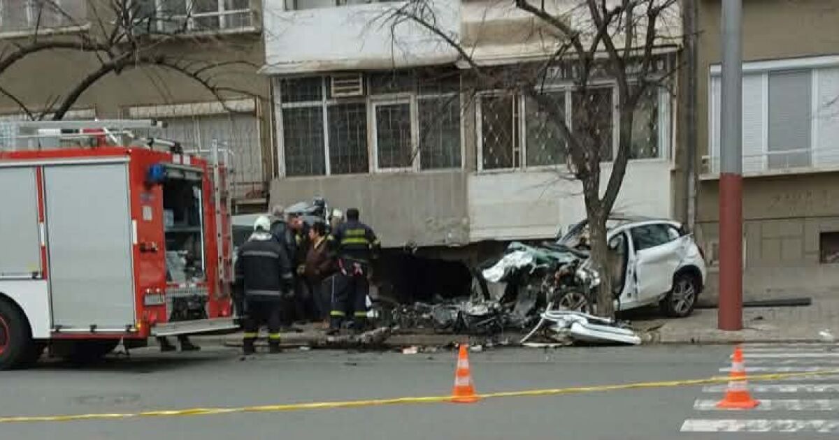 Колата е почти смазана отпред и от нея излиза дим. На място е изпратена и пожарна, става ясно от кадри, заснети от хора в близките сгради.