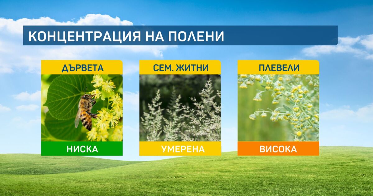 При дърветата концентрацията на полени във въздуха ще бъде ниска, при сем. Житни - в градовете - ниска, а в планините - умерена.