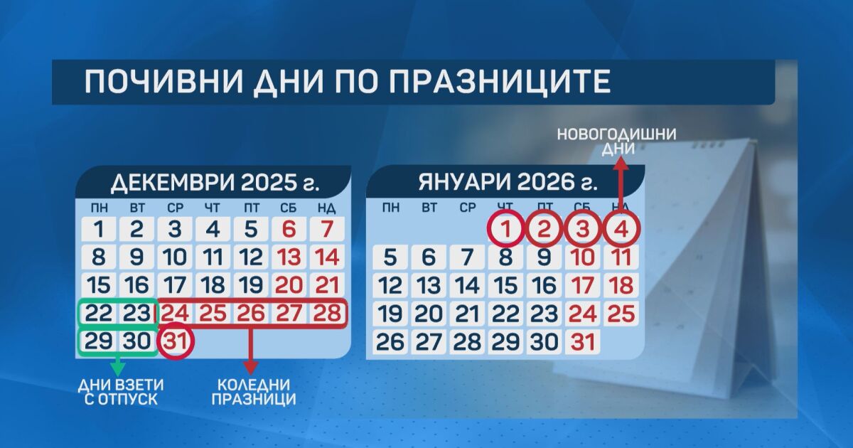 След почивните 20 и 21 декември следват два работни, които може да се вземат като отпуска, коледните празници и още един уикенд.