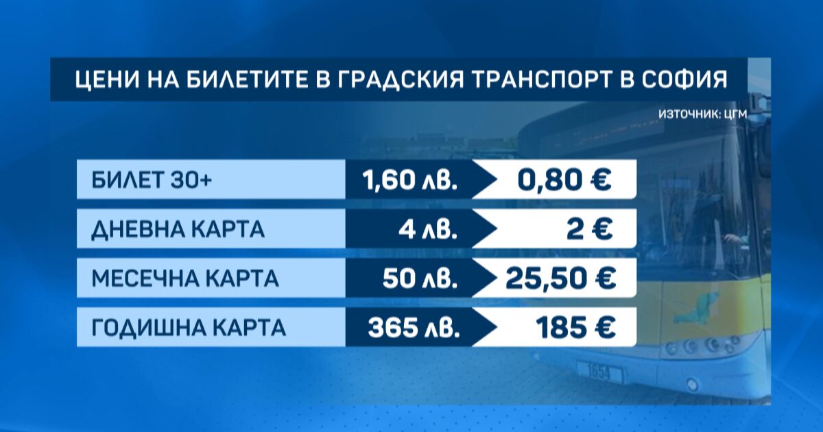 Билетът вече струва 80 евроцента вместо 1,60 лева. Дневната карта от 4 лева става 2 евро. 25,50 евро ще ни струва месечната карта за всички линии от градския транспорт.