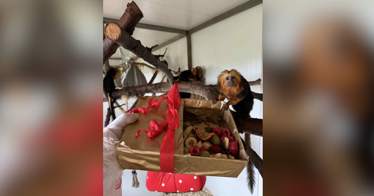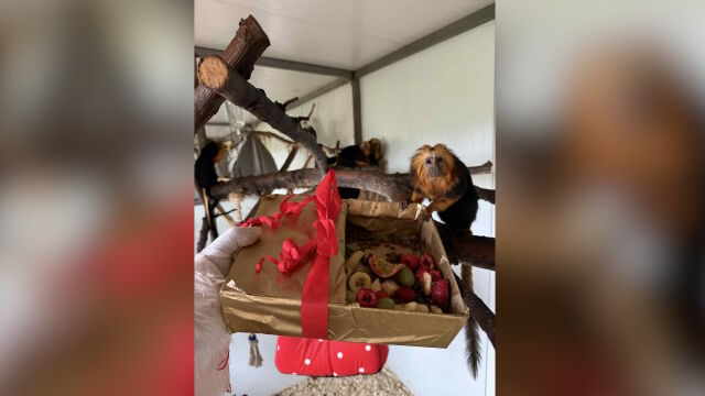 Лъвските тамарини – едни от най-дребните и любопитни маймунки, с интерес разопаковаха кутиите, а тамарините пинчи се пъхнаха почти целите в подаръците, за да открият какво има вътре.