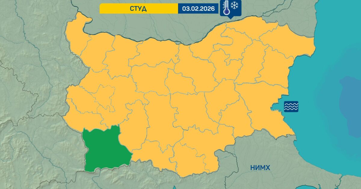 Жълт код за студено време е обявен във всички области от страна с изключение на област Благоевград. Минималните температури ще са между минус 14° и минус 9° и през деня стойностите ще се задържат под 0°.