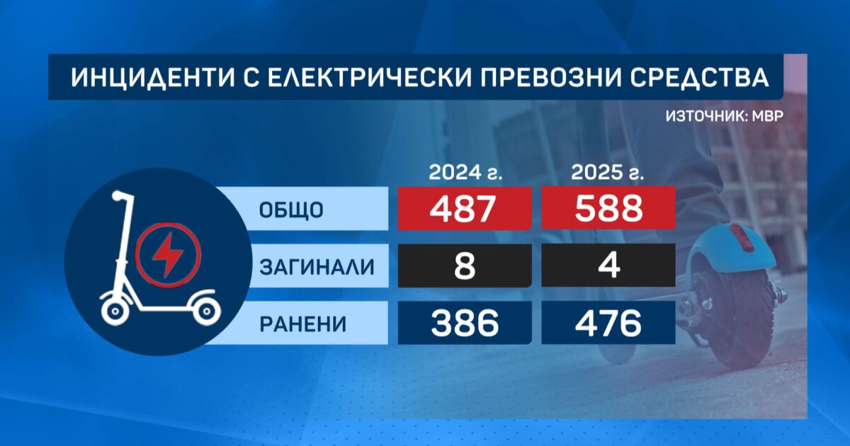 През 2025 година след инцидент с електрическо превозно средство са пострадали общо 144 деца. От тях - 10 са на възраст между 6 и 9 години.