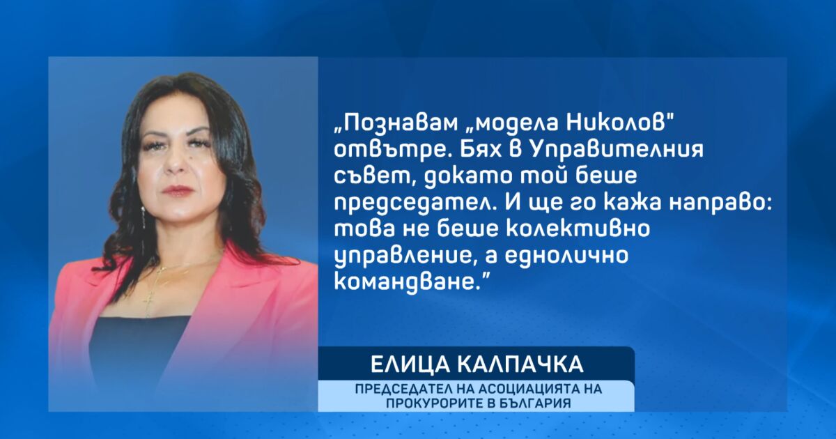 В писмена позиция председателят на Асоциацията на прокурорите в България Елица Калпачка определи управлението на предшественика си Владимир Николов като „еднолично командване“.