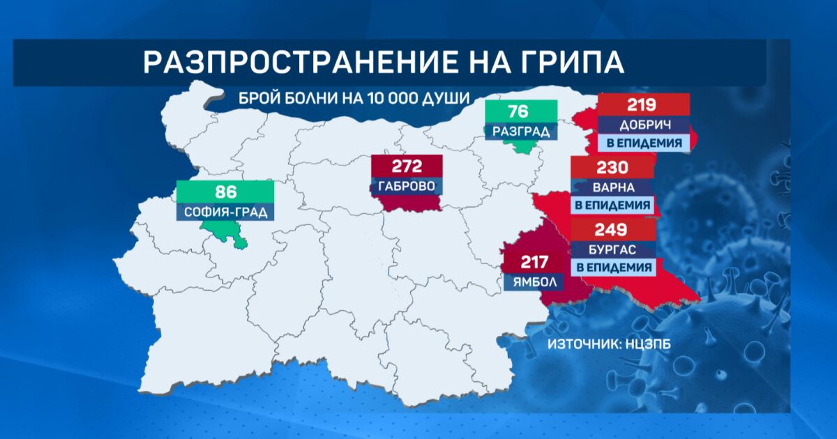 В морската столица последните данни отчитат малък спад на болните, но все пак броят им остава сред най-високите в страната. С рекордна заболеваемост е област Габрово - 272-а случая на 10 хиляди души, като при децата до 4 години едно от пет е с грип. Сред областите с най-много болни е и и Ямбол. Най-малко болни продължава да има в София и Разград.