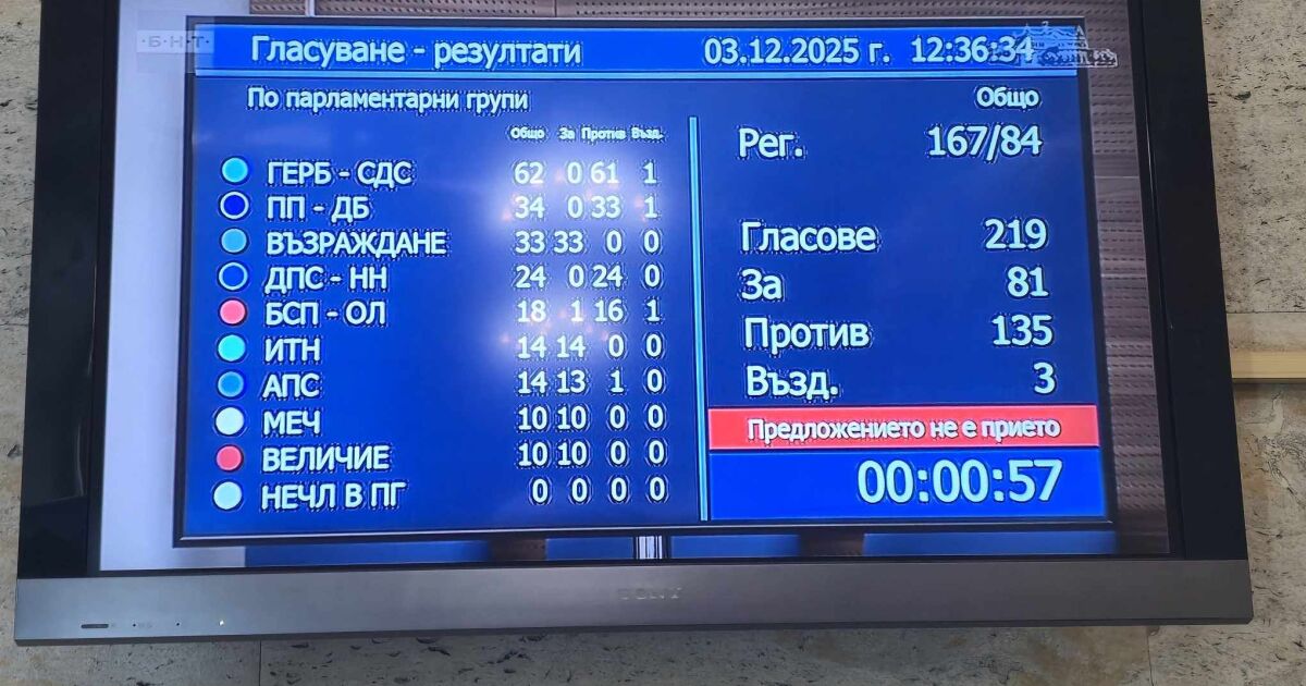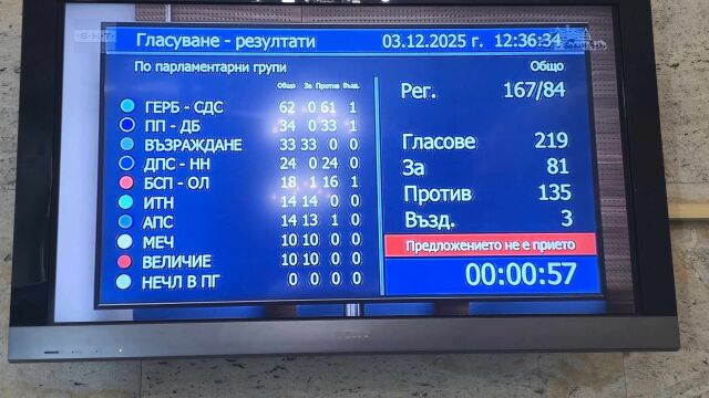 Народното събрание отхвърли предложението за референдум за еврото. 135 депутати бяха против. Предложението беше подкрепено от всички депутати на ИТН, АПС, МЕЧ, "Величие" и "Възраждане". Против бяха групите на ГЕРБ, ПП-ДБ, ДПС-НН и БСП.