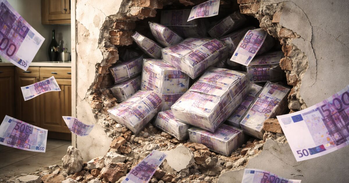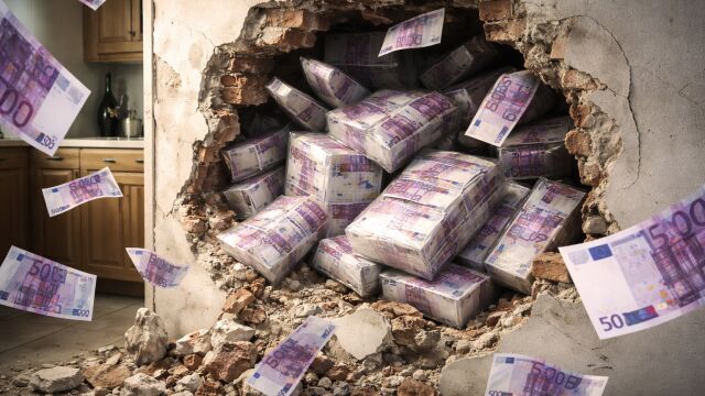 При обиск в къщата на родителите му, разлютващите разбиват стена в кухнята и намират скритите пари – над 600 банкноти по 500 евро, прибрани в специални защитни пакети. Обяснението му за зазиданите пари звучи комично – парите не са негови, а на родителите му и са спечелени от земеделие.