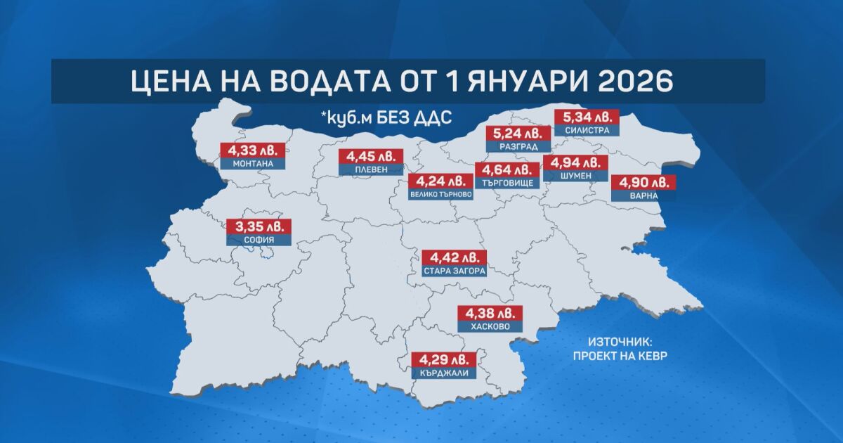 Цените ще бъдат актуализирани в редица български градове, като най-скъпа ще бъде водата в Разград и Силистра - съответно 5 лева и 24 стотинки и 5 лева и 34 стотинки за кубичен метър без ДДС.