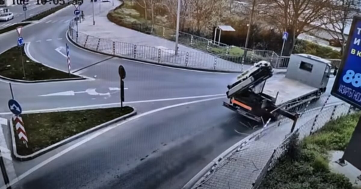 На видеото се вижда как огромен тир помита ограда на тротоар на кръстовище в Стара Загора. Шофьорът изобщо не спира, след като разрушава почти цялата ограда на кръстовището. Но благодарение на камерите, установяват нарушителят. По чудо не е имало пешеходци по същото време.