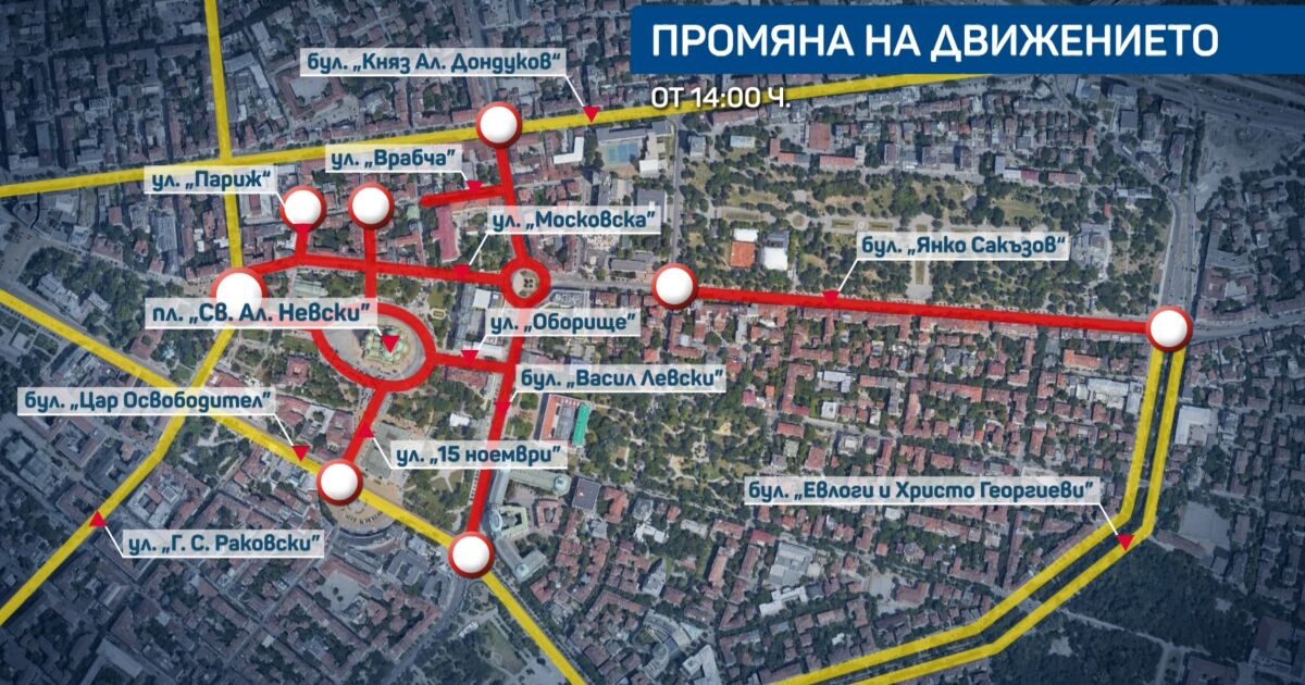 От 8:00 до 14:00 часа автомобилите не могат да преминават по булевардите „Васил Левски“ и „Янко Сакъзов“. Градският транспорт в района продължава да се движи.