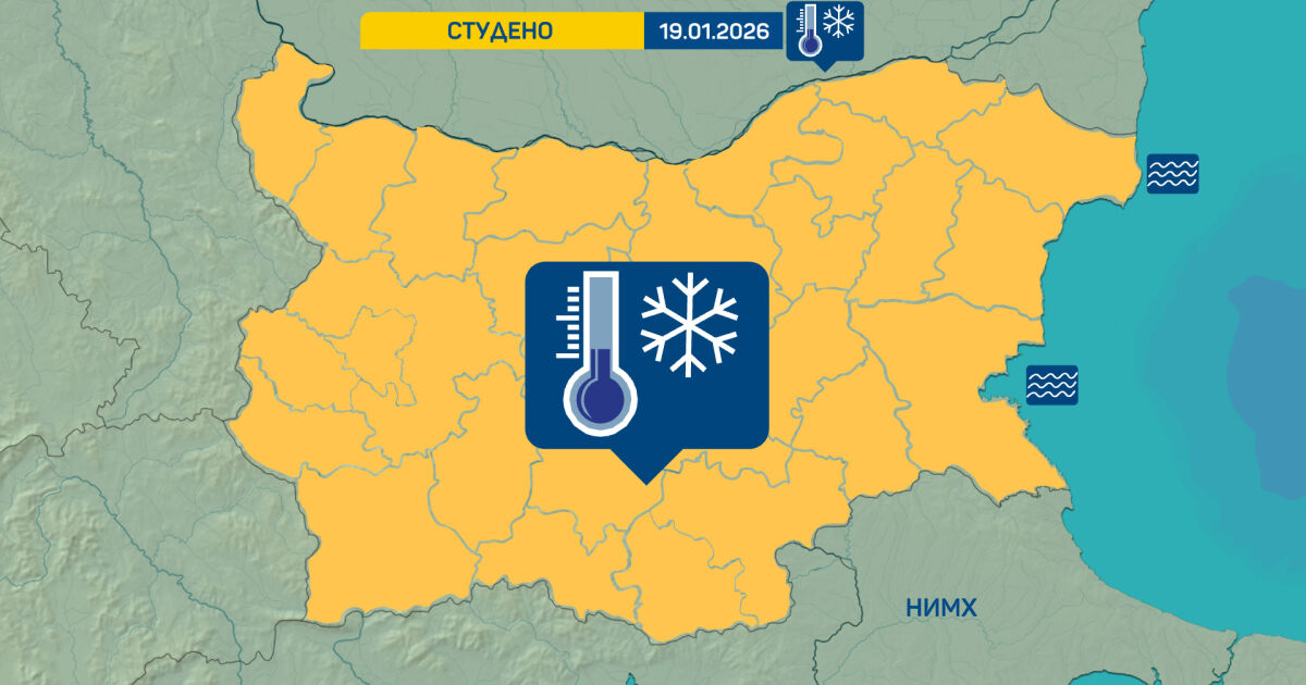 Жълт код за много ниски температури във всички области от страната е обявен за понеделник, 19 януари. Минималните стойности ще достигнат до минус 12 градуса, а максималните почти навсякъде ще се задържат отрицателни.