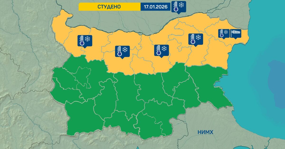 Слънчево, но и много студено време ни очаква утре. За 14 области от страната е обявен Жълт код за много ниски температури. Предстои максималните стойности в цяла Северна България да останат отрицателни през целия ден, а минималните на места ще достигат -10 градуса. В една област от Североизточна България – област Добрич, освен за студено време, предупреждение от първа степен е обявено и за силен вятър, чиито пориви ще достигат 80 километра в час.