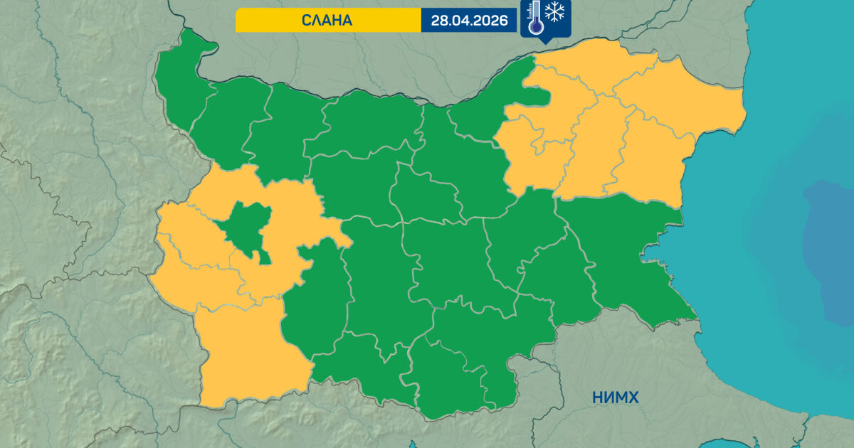 Предупредителен жълт код за условия за образуване на слани е обявен за 6 области от Североизточна и 4 области от Югозападна България утре. Това са Варна, Добрич, Търговище, Разград, Силистра, Шумен, Благоевград, Кюстендил, Перник и София област.