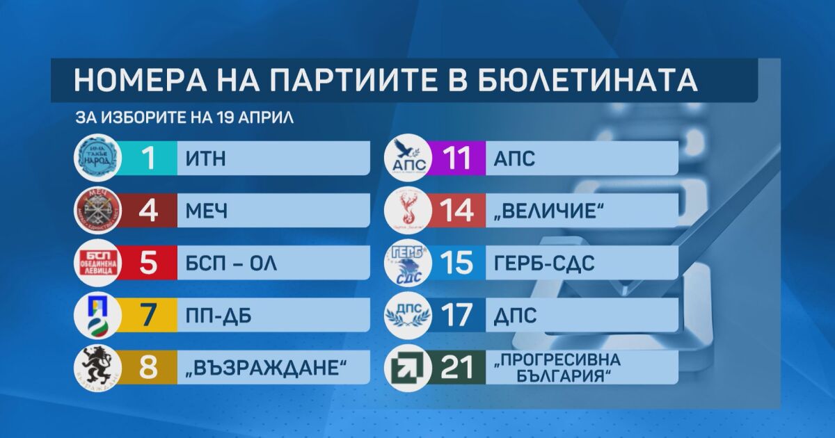 Жребият е хвърлен – номерата в бюлетината за предсрочните избори на 19 април вече са ясни. Късметът отреди номер едно на „Има такъв народ“. Под номер 4 ще бъде партия МЕЧ, "БСП-Обединена левица" получи номер 5. Коалицията „Продължаваме промяната – Демократична България“ е с номер 7, а номер 8 се падна на „Възраждане“.
