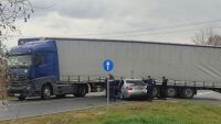 Тир влезе в насрещното и отнесе 100 м мантинела на АМ "Струма", кола се удари в него