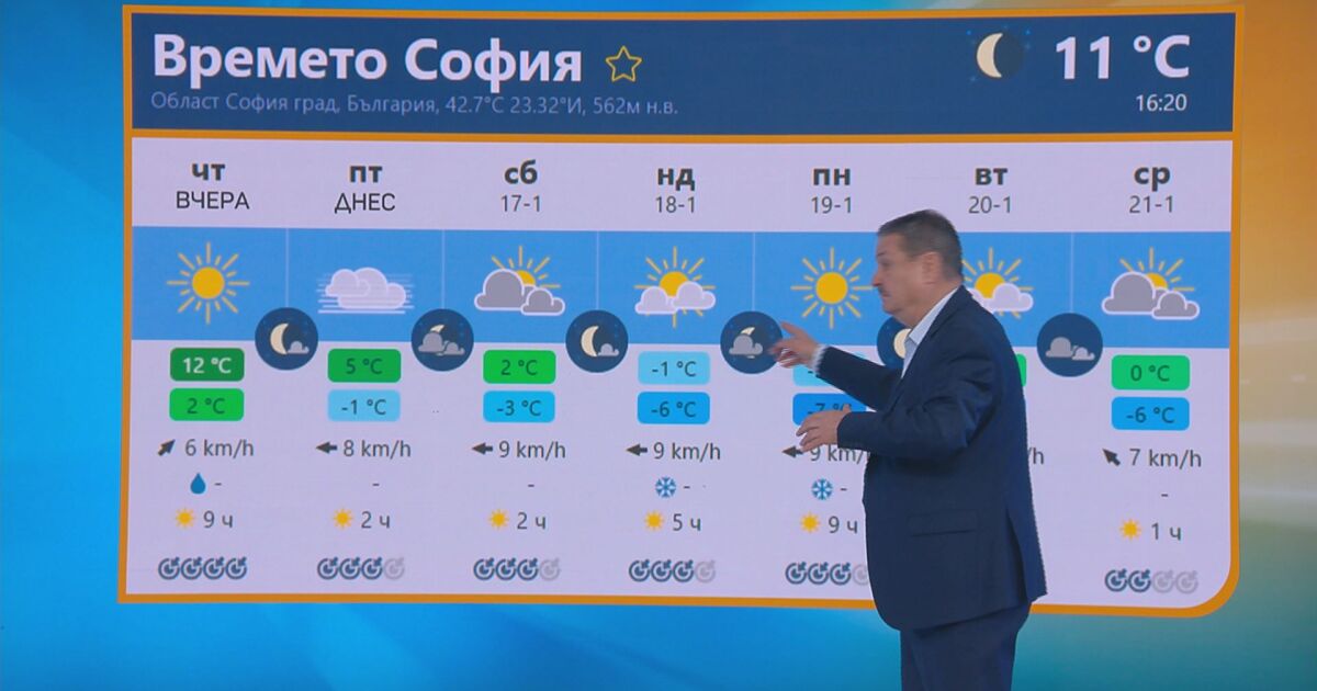 „Ще има ефирни снежинки, които ще направят снежна покривка от 1-2 см. Сравнително слаби валежи“, допълни климатологът.