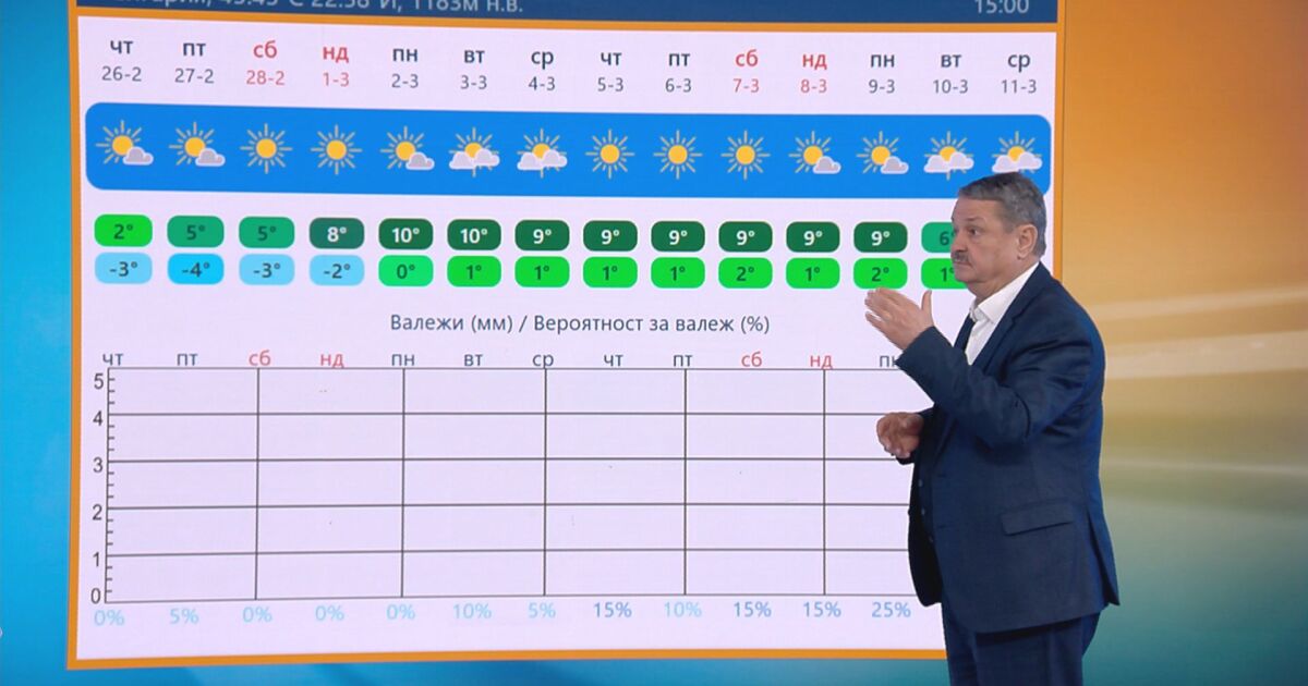 И в планините ще е слънчево, сухо и сравнително топло за началото на март месец. Условията за спорт и туризъм ще бъдат перфектни и във високата планина, защото не се очакват ветрове и снегове. Пределно ниски температури няма да има, каза още Рачев.