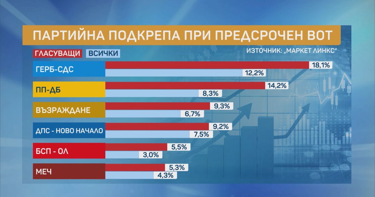 При евентуални предсрочни избори ГЕРБ-СДС остава първа политическа сила, следвана от ПП-ДБ. За третото място според данните се конкурират „Възраждане“ и „ДПС - Ново начало“.