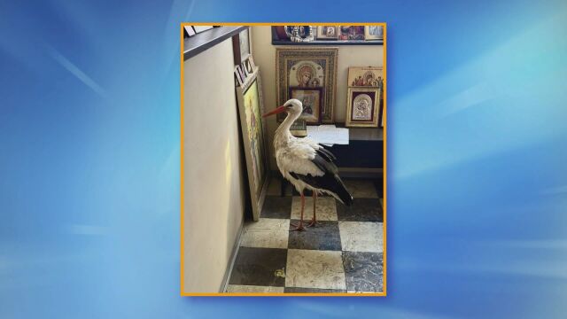 Премръзнал щъркел потърси спасение от студа в малък параклис край Бургас. Птицата не е отлетяла на юг, а температурите в морския град са около -5 градуса.
