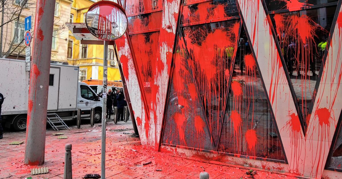 Сградата на ЕК беше залята с червена боя и обстрелвана с яйца, имаше и хвърляне на димки.