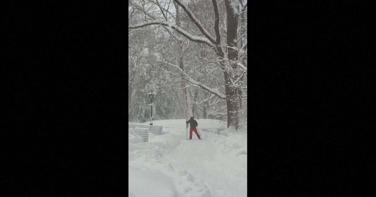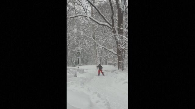 Нюйоркчани се забавляваха със ски по заснежените пътеки в Сентрал Парк в понеделник, след като силна буря покри града с обилни снеговалежи.