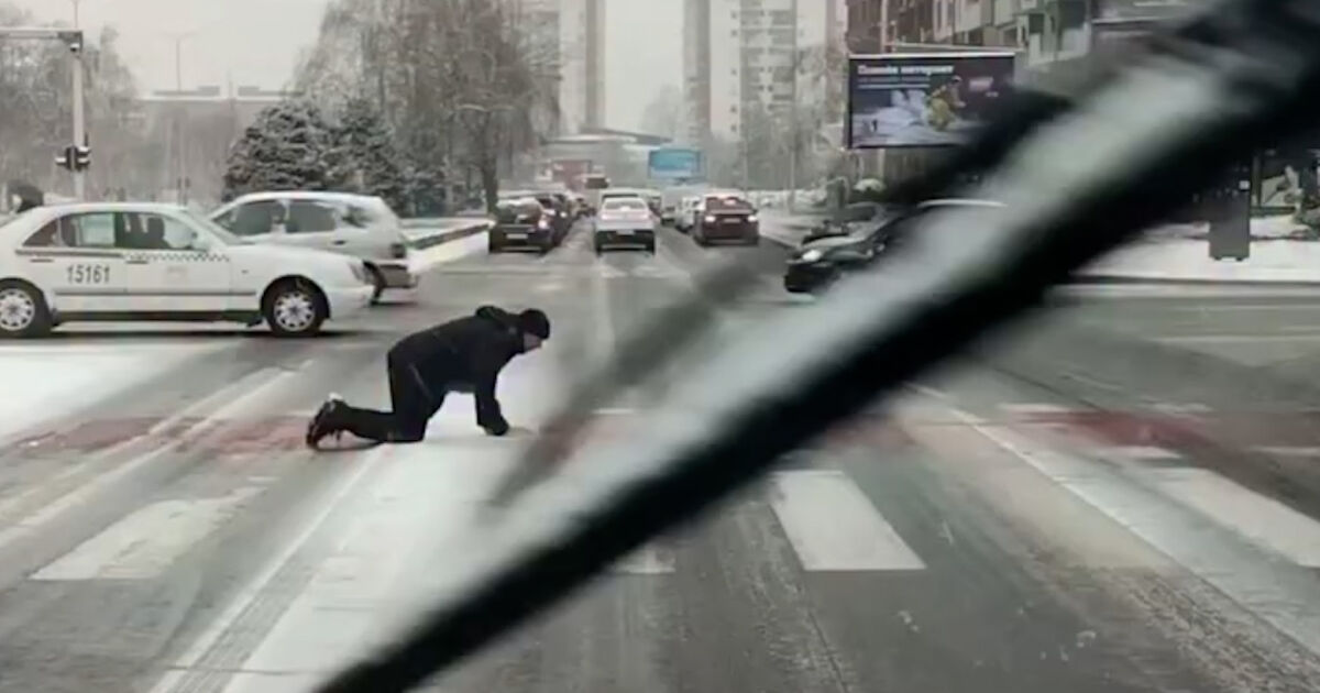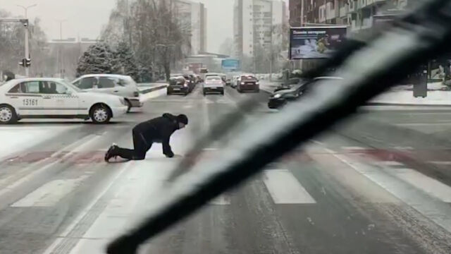 В столицата на Северна Македония беше заснет и необичаен случай, който бързо привлече общественото внимание. На видеото се вижда мъж, който от страх да не се подхлъзне, преминава пешеходна пътека, пълзешком по леда.