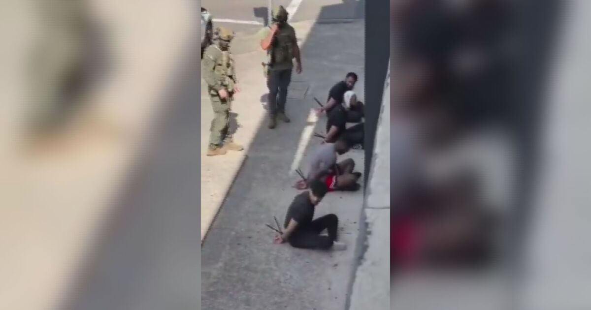 Тежко въоръжени оперативни служители са прихванали два автомобила на оживена улица, а кадри показват заподозрени, вързани с кабели отстрани на пътя.
