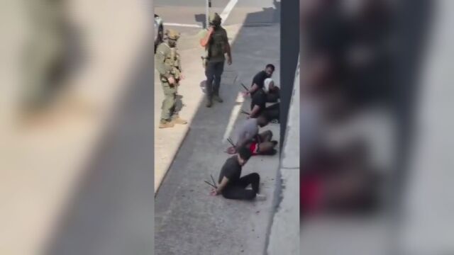 Изображенията показват също няколко тежко въоръжени полицаи в камуфлажни дрехи, както и задържани мъже с ръце, вързани зад гърба, строени до близка ограда.
