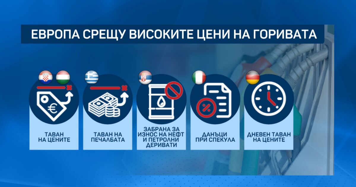 Хърватия и Унгария бяха сред първите държави в Европа, които въведоха таван на цените на горивата заради войната. В Гърция от днес има таван на печалбата. В съседна Сърбия забраниха износа на нефт и петролни деривати. В Италия при спекула ще има вдигане на данъците на провинилите се. Мерки днес взе и Германия – дневен таван на цените.