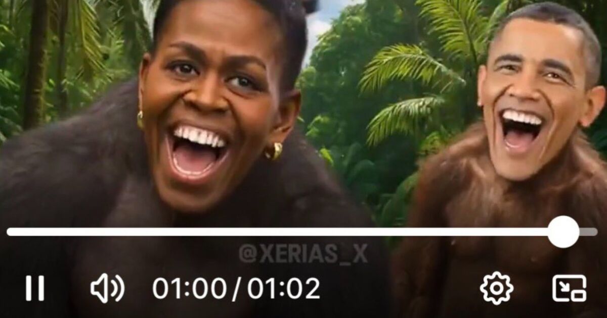 В едноминутния видеоклип, публикуван на платформата Truth Social на Тръмп, Обама и съпругата му се появяват с лицата си върху телата на маймуни за около една секунда, пише АФП.