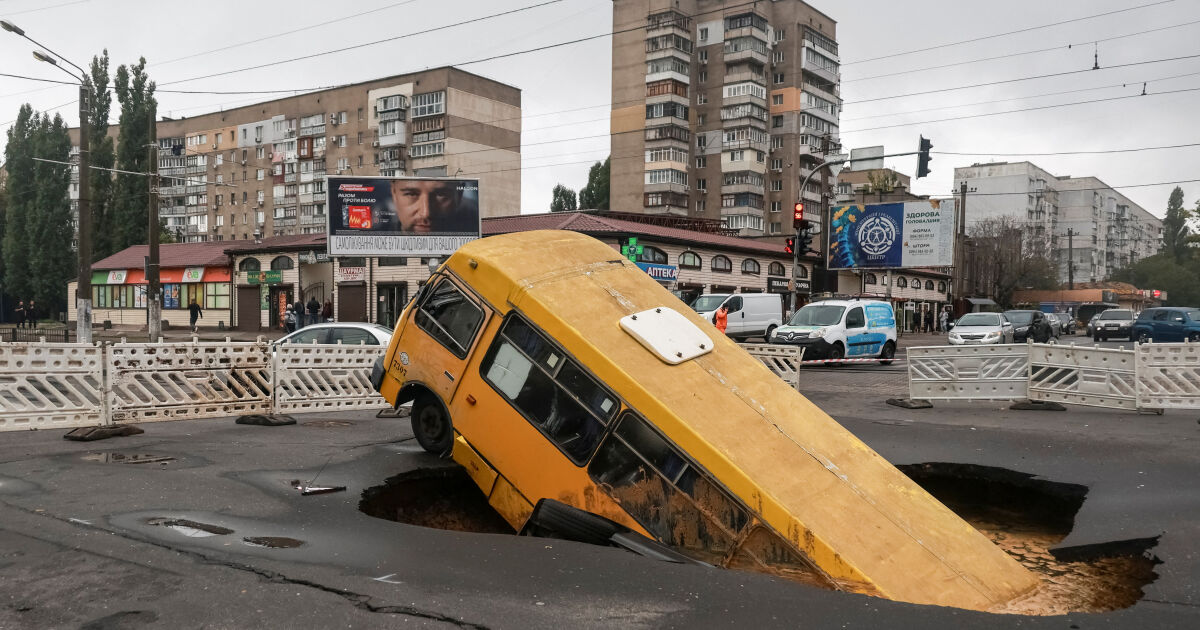 На снимки се вижда как жители се разхождат близо до автобус и кола, заседнали в огромна дупка, образувала се на път след безпрецедентните валежи в Одеса.